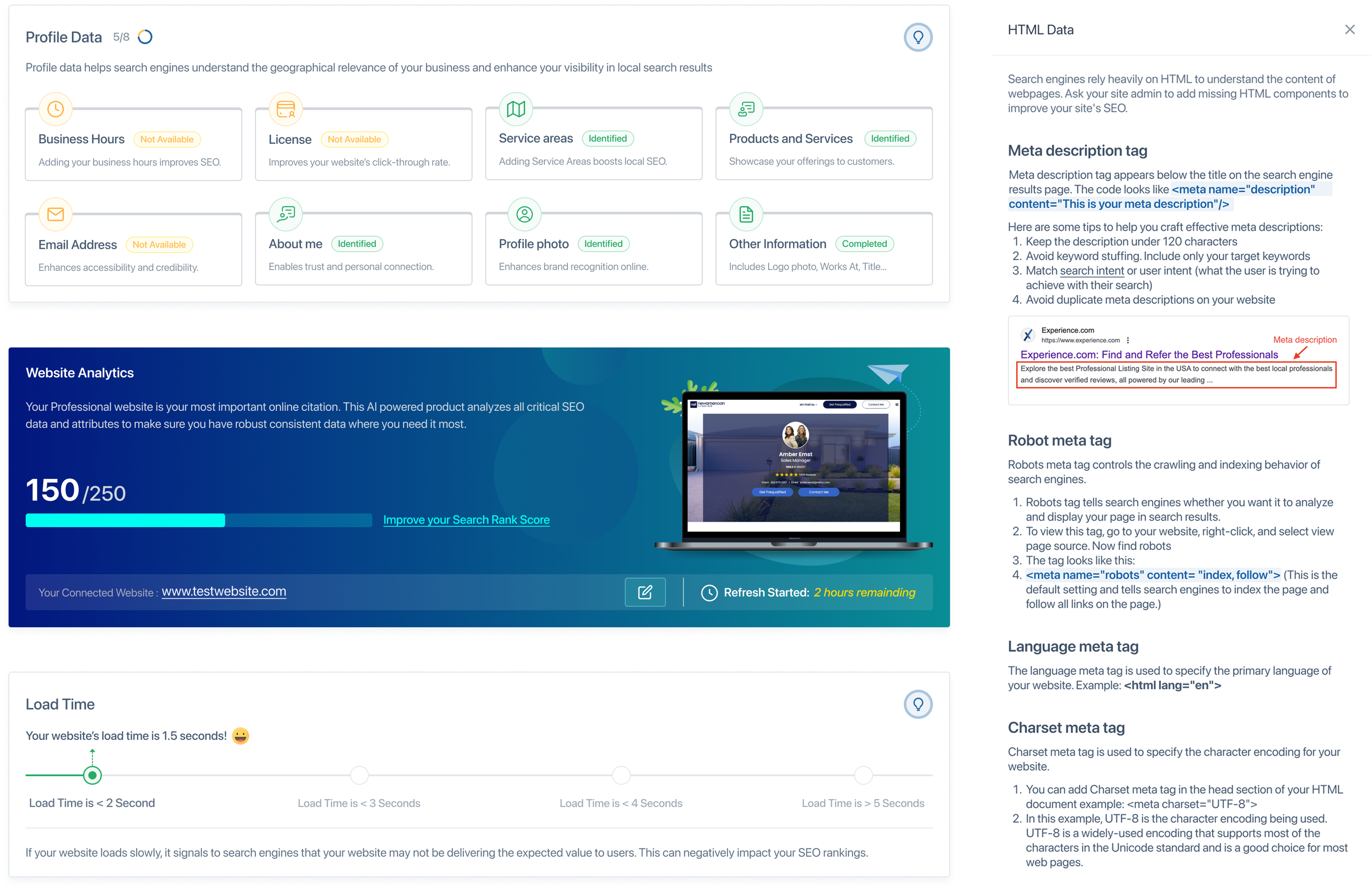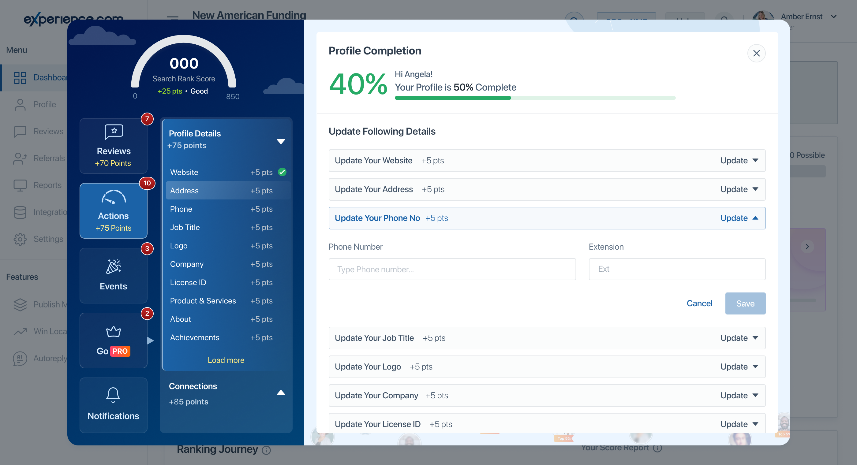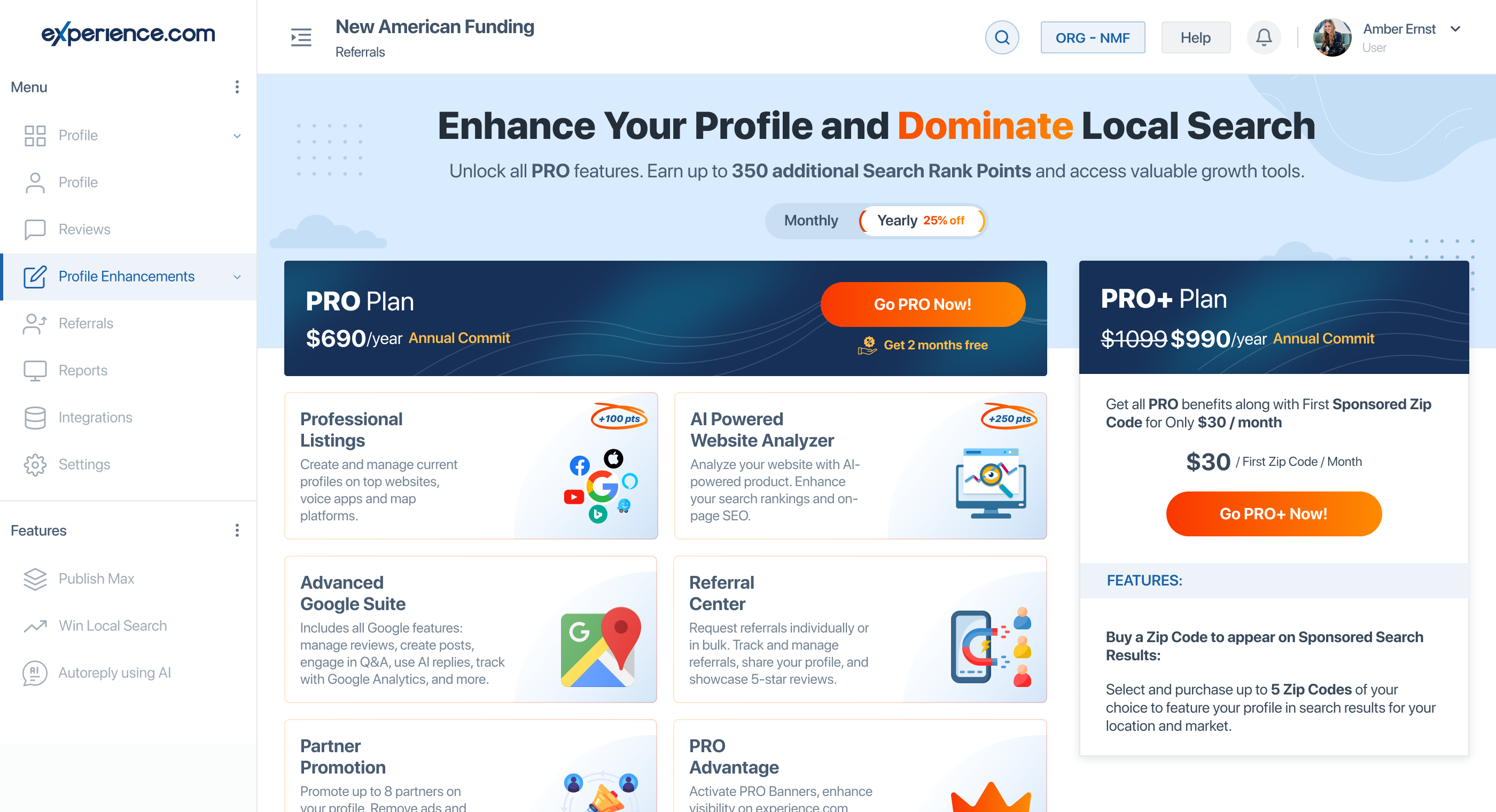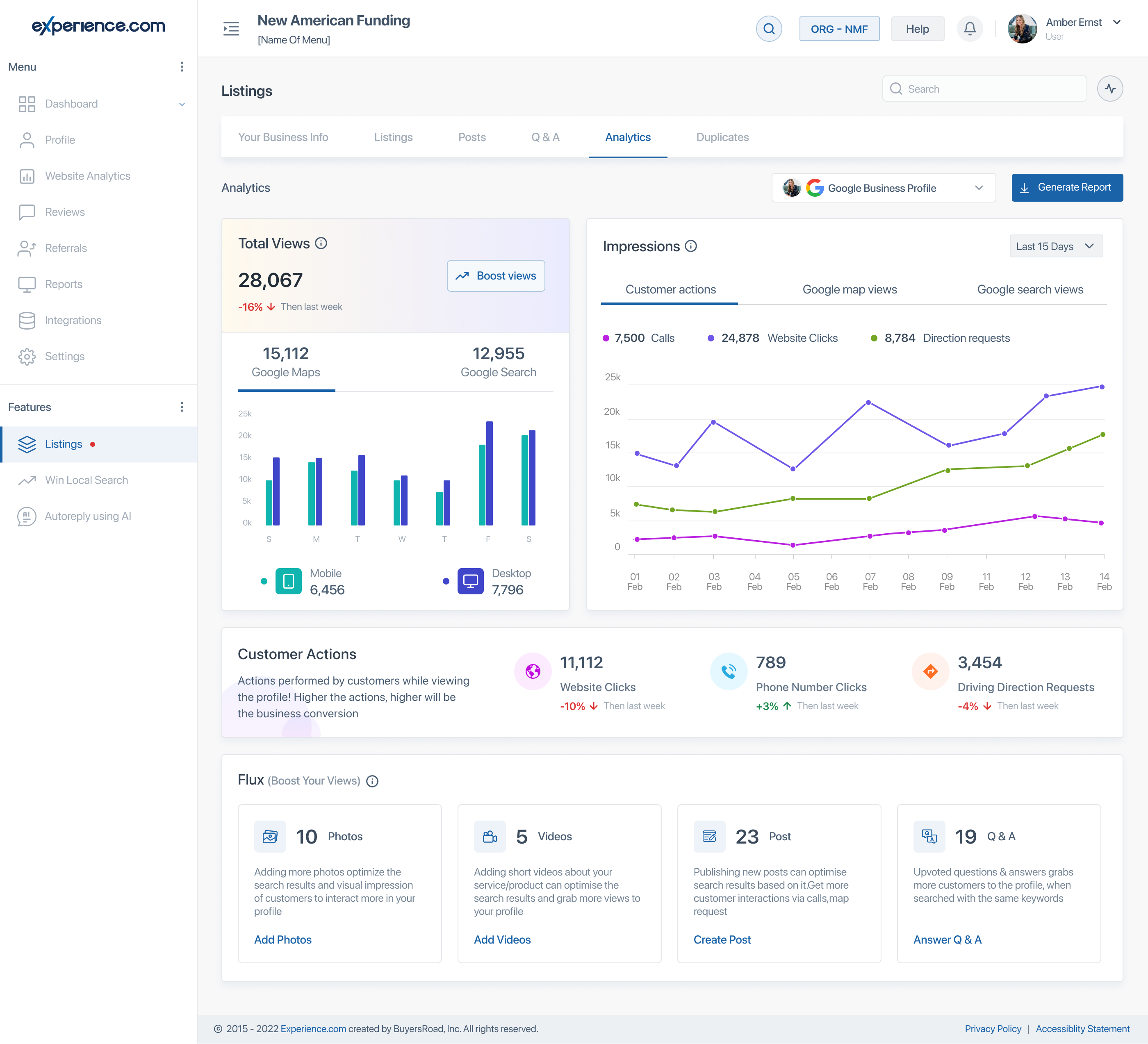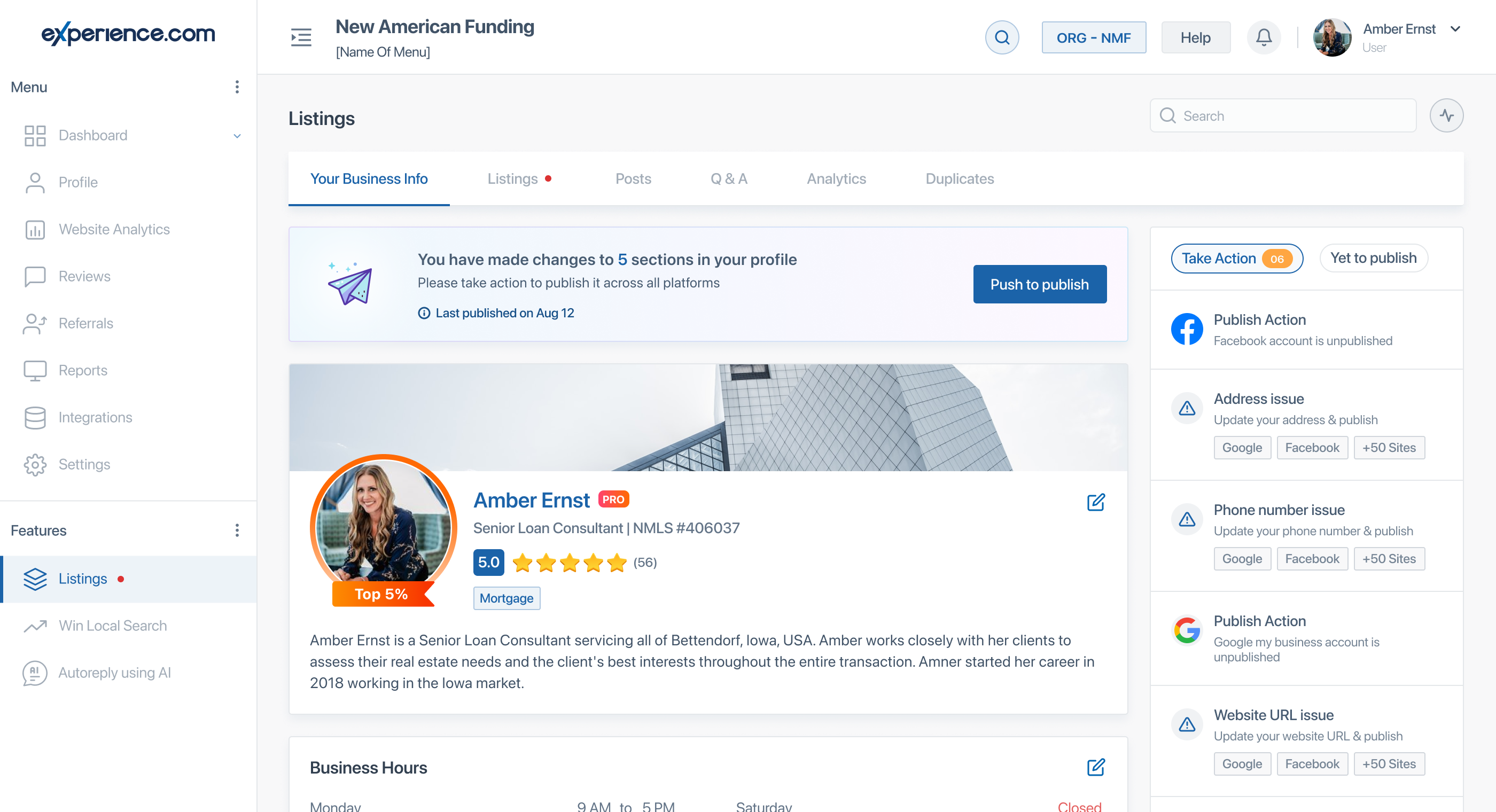The goal of this project was to bring the power of the Experience.com enterprise platform to a new audience: small businesses and independent professionals. The platform—originally designed for large businesses to manage their customer experience and online reputation—includes robust tools like survey creation, review management, listings management, SEO analysis, and more. Our challenge was to adapt these enterprise-grade features into a streamlined, self-serve experience tailored for individual professionals like mortgage loan officers and real estate agents, helping them grow their business and stand out online.